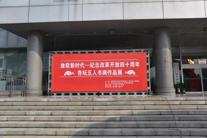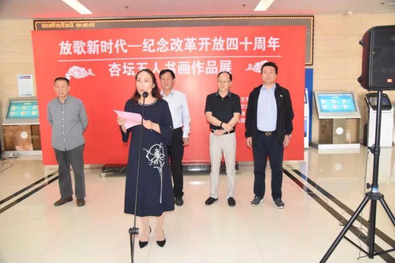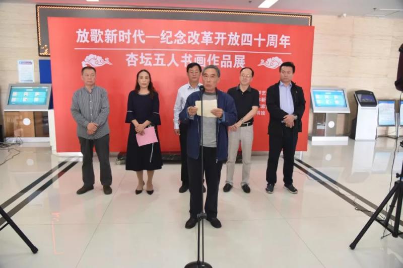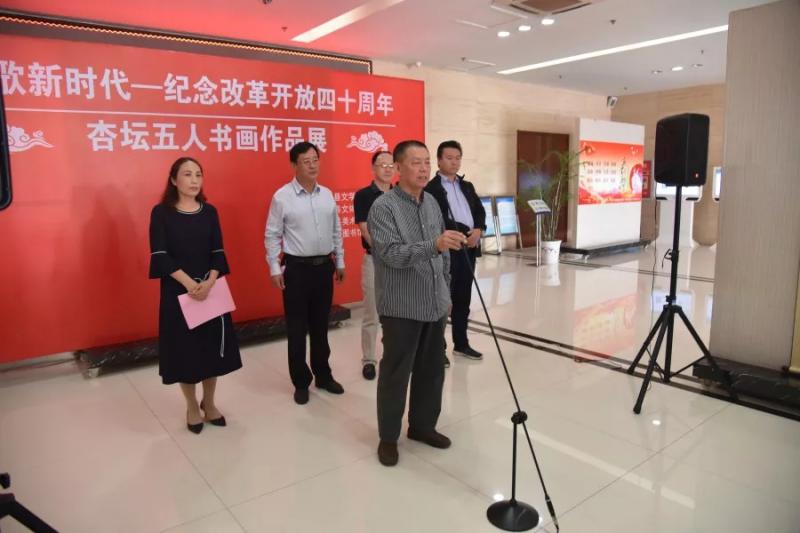 9月26日上午,为纪念改革开放四十周年,深入贯彻党的十九大精神,由邹平县文体新局、县文学艺术界联合会主办,邹平县图书馆、县美术家协会承办的“纪念改革开放四十周年杏坛五人书画作品展”在图书馆一楼大厅开幕。参展的五位作者是:吕象杰、张兆忠、夏文超、刘殿奎、王安。