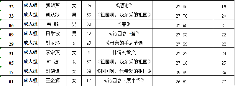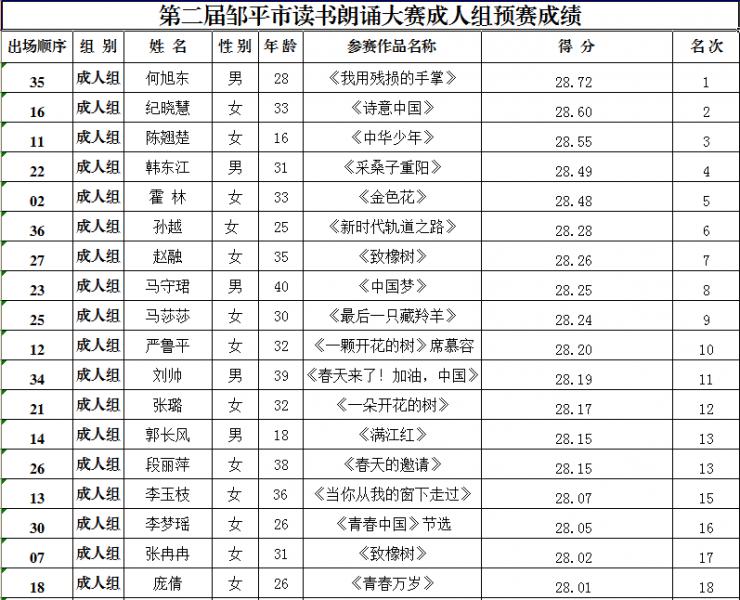 2019年3月31日,经过一天紧张的比赛,第二届邹平市读书朗诵大赛成人组预赛成绩公布如下: