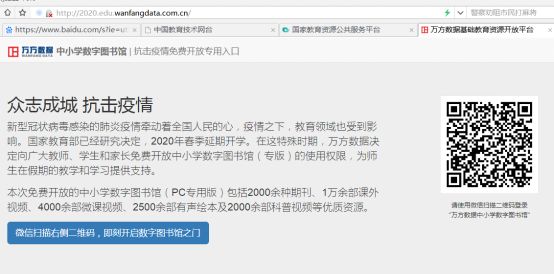 新型冠状病毒感染的肺炎疫情防控期间,中小学生寒假延期,邹平市图书馆联合万方数据向广大中小学生、老师及家长免费开放“万方数据中小学数字图书馆(PC专用版)”使用,网站资源包含有2000余种期刊,1万余部课外视频、4000余部微课视频、2500余部有声绘本及2000余部科普视频等优质资源,为读者在假期的教学和学习提供支持。