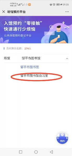1.关注"邹平市图书馆"微信公众号,点击底部菜单栏“读者服务”-“预约进馆”进入预约页面。
