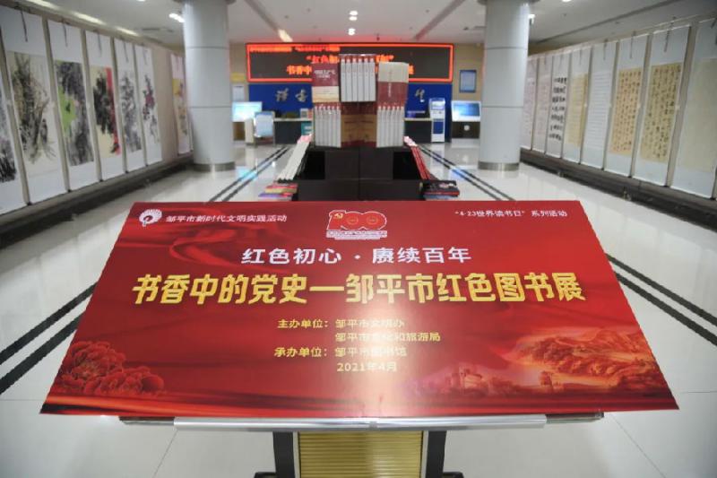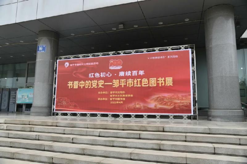 4月22日,在“4·23世界读书日到来之际”,为庆祝中国共产党成立100周年,由邹平市文明办、邹平市文化和旅游局主办,邹平市图书馆承办的“红色初心·赓续百年”书香中的党史——邹平市红色图书展在图书馆一楼大厅举办。