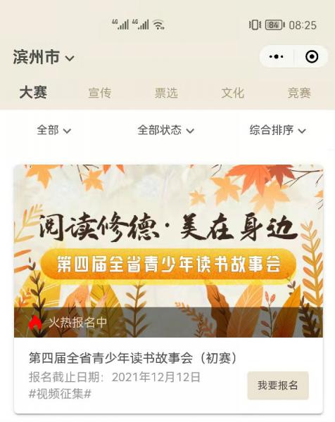 为引导广大青少年通过讲述身边的自然之美、生活之美、榜样之美等故事,发现美、表达美、践行美、传递美,积极践行社会主义核心价值观,树立正确的审美观念,学习身边美德,争做崇德向善新一代。由滨州市文化和旅游局主办,滨州市图书馆、各区县文化和旅游局、图书馆承办的首届全市青少年读书故事会暨第四届全省青少年读书故事会滨州赛区选拔赛活动开始报名啦!