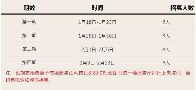 注:每期志愿者请于志愿服务活动首日8:20按时到图书馆一楼报告厅进行上岗培训,另请留意电话和短信提醒。