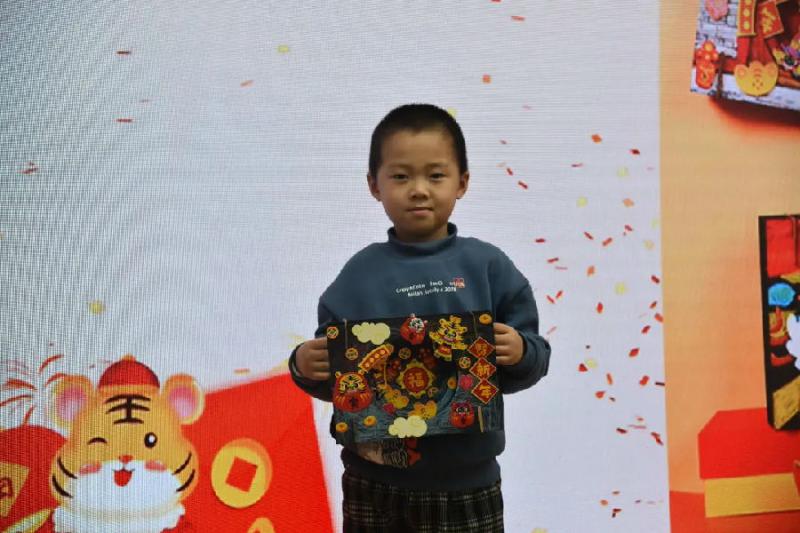 课程介绍了“春”字的起源,讲解了春节放鞭炮、贴对联、穿红衣、吃水饺、蒸花糕的习俗。手工环节,大家一起完成了“虎年立体画”的制作,涂画、裁剪、粘贴、定型,一气呵成。很快“恭贺新春”、“年年有余”、“如虎添翼”、“虎虎生威”四个主题的立体画尽现眼前,小老虎也在孩子们的手中更显“霸气神威”。