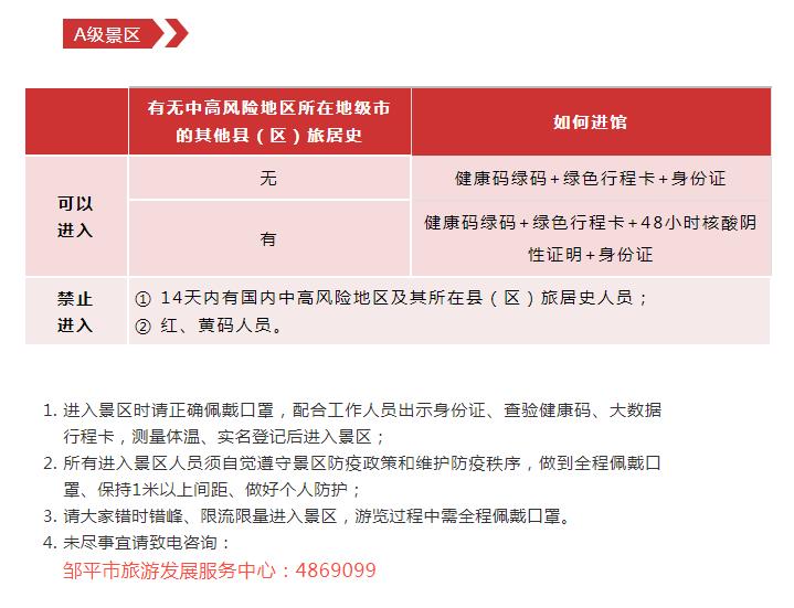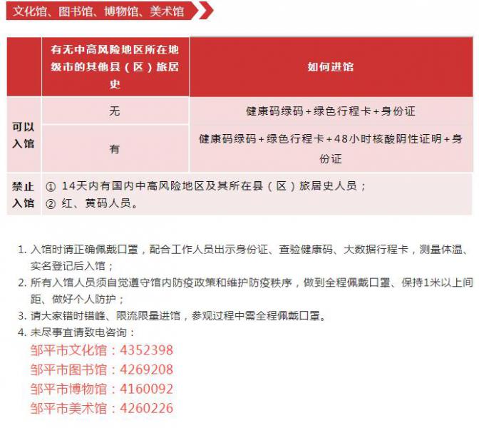 近期,疫情防控形势骤然紧张,为确保广大市民朋友和来邹游客的生命安全和身体健康,根据最新疫情防控要求,邹平市各公共文化场馆、A级景区将进一步加强疫情防控工作,具体要求如下: