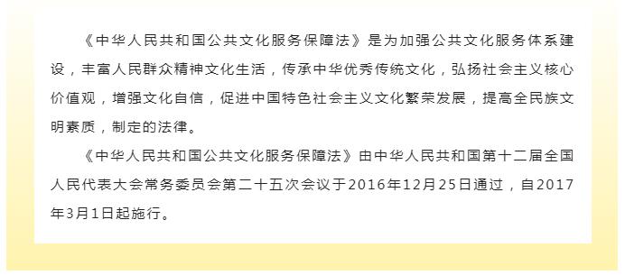 第一条 为了加强公共文化服务体系建设,丰富人民群众精神文化生活,传承中华优秀传统文化,弘扬社会主义核心价值观,增强文化自信,促进中国特色社会主义文化繁荣发展,提高全民族文明素质,制定本法。