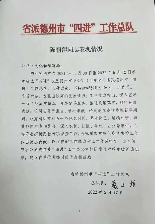 近期,省派德州市“四进”工作总队发布“陈丽萍同志表现情况”,邹平市图书馆陈丽萍在阶段性考核中被评为优秀。