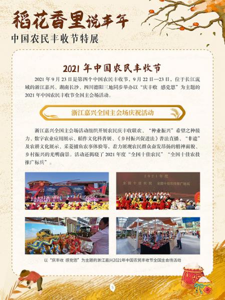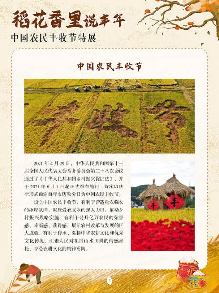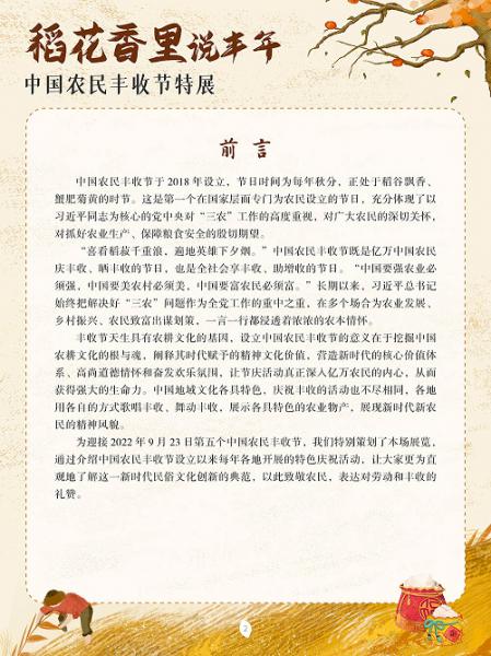 中国农民丰收节于2018年设立,节日时间为每年秋分,正处于稻谷飘香、蟹肥菊黄的时节。这是第一个在国家层面专门为农民设立的节日。中国地域文化各具特色,庆祝丰收的活动也不尽相同,各地用各自的方式歌唱丰收、舞动丰收,展示各具特色的农业物产,展现新时代新农民的精神风貌。为迎接2022年9月23日第五个中国农民丰收节,我们特别策划了本场展览,通过介绍中国农民丰收节设立以来每年各地开展的特色庆祝活动,让大家更为直观地了解这一新时代民俗文化创新的典范,以此致敬农民,表达对劳动和丰收的礼赞。