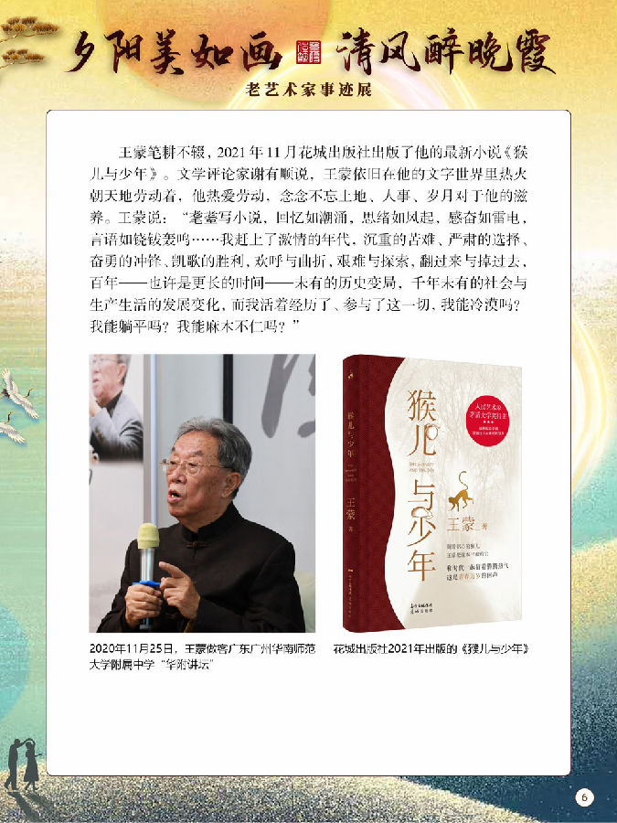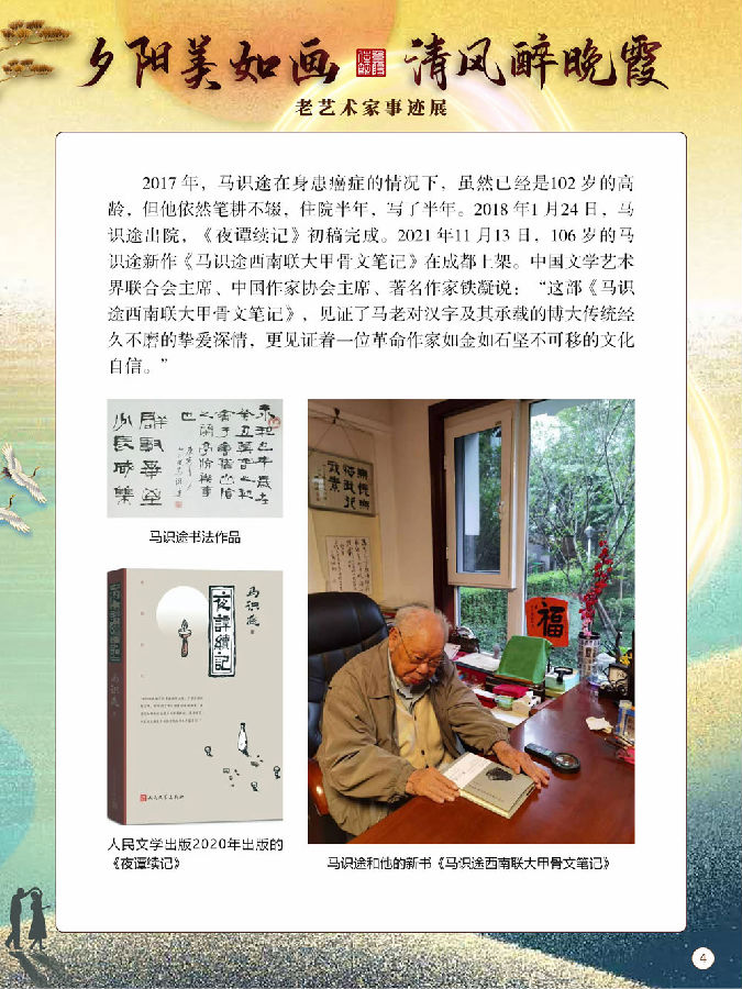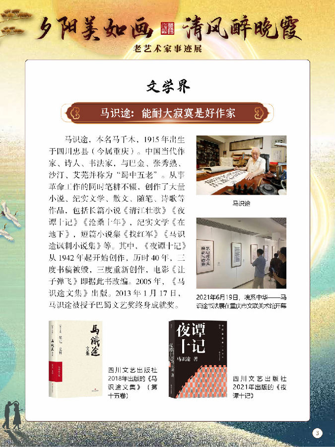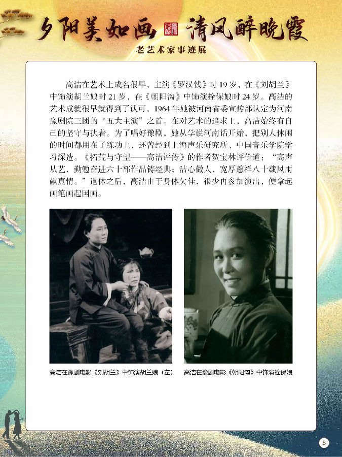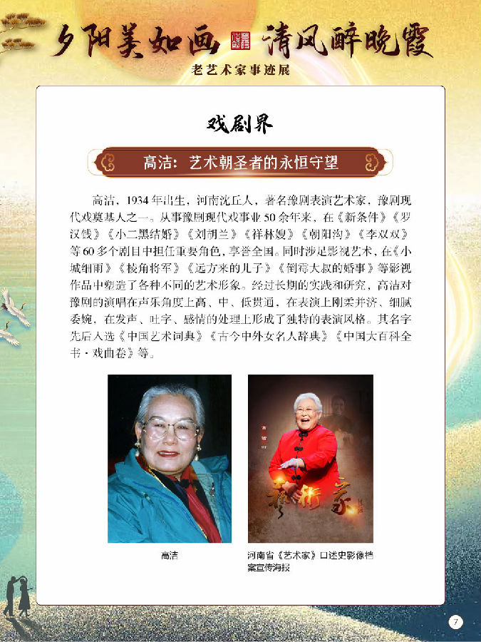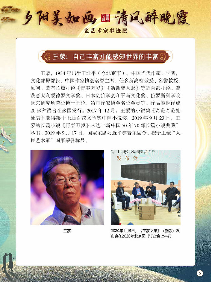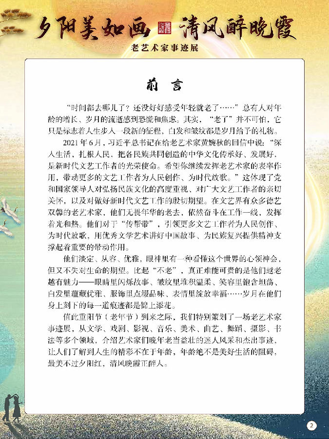 值此重阳节(老年节)到来之际,我们特别策划了一场老艺术家事迹展,从文学、戏剧、影视、音乐、美术、曲艺、舞蹈、摄影、书法等多个领域,介绍艺术家们晚年老当益壮的迷人风采和杰出事迹,让人们了解到人生的精彩不在于年龄,年龄绝不是美好生活的阻碍,最美不过夕阳红,清风晚霞正醉人。