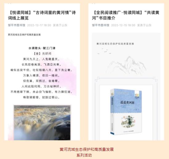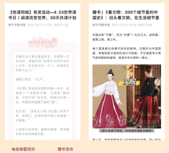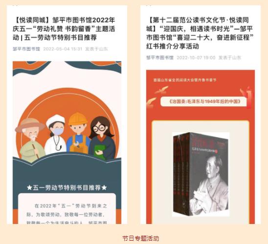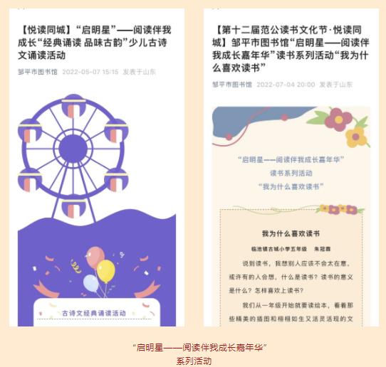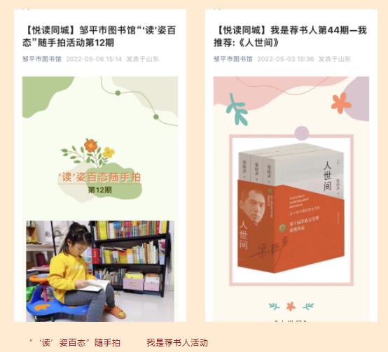 近年来,邹平市图书馆用心打造品牌活动,持续开展走进图书馆、邹图公开课、古琴公开课、读书朗诵大赛、“青春志愿行”文化志愿服务活动、尼山画廊等。2022年又新创建“悦读同城” 品牌,开展了丰富多彩的线上线下全民阅读推广活动100余场,参与读者近5万人,在全市营造了浓厚的阅读氛围。