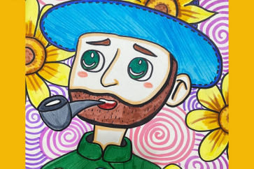 绘画演示环节,主讲老师与孩子们一起,在8开卡纸中间位置起画出梵高人物脸部和半身形象,突出梵高标志性特点络腮胡、高鼻梁、帽子或烟斗;引导孩子们利用遮挡关系布局向日葵元素,最后与孩子们一起在空白区域添加了简单的螺旋线条,这样就完成了自画像的临摹与再创作。