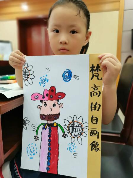 孩子们开始绘画前,主讲老师对本次课程的绘画知识重新做了梳理,引导孩子们思考自画像需要的知识、注意事项以及观察法在绘画中的作用,肖像画要特别注意突出五官标志性特点等。交流过后,大家一起展示了自己的作品。绚丽的色彩、旋转的长短线条、灵动的画面,各具特色的自画像创意,孩子们用自己的画笔向我们展示了他们眼中不一样的梵高。