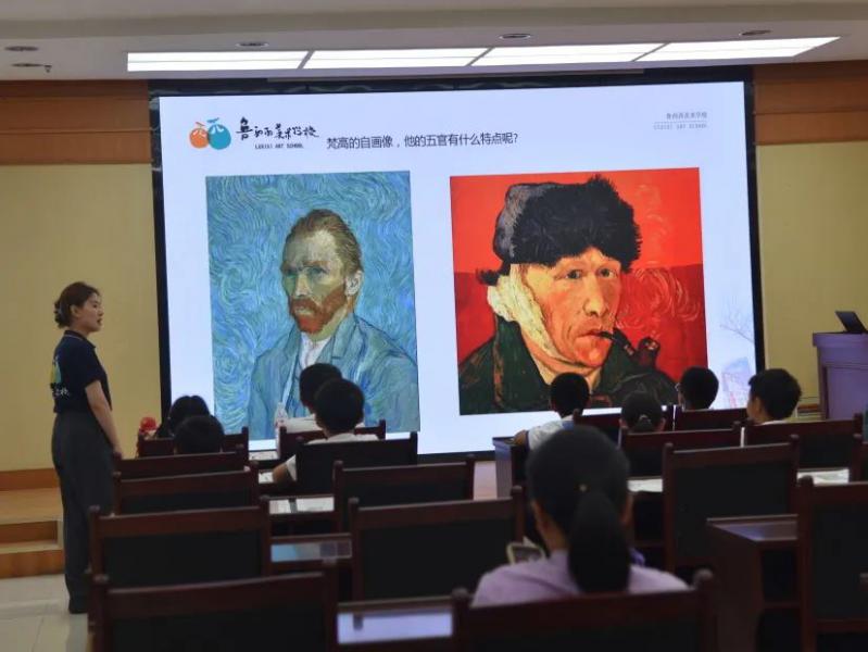 主讲老师采用ppt授课,首先带领孩子们认识、了解梵高的生平和作品,为孩子们讲解作品《梵高自画像》,逐一梳理《鸢尾花》、《星月夜》和《向日葵》中的绘画元素;着重带领孩子们观察梵高五官特点,感受梵高作品中的色彩搭配和线条,集中向孩子们展示了“别人眼中的梵高”:Q版梵高、不同脸型的梵高、戴帽子的梵高等等,为孩子们作画提供了一定的理论基础。
