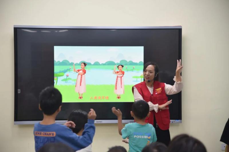“远看山有色,近听水无声.....”,一首活泼、轻快的诗词律动响起,孩子们纷纷起身、伸出小手与周老师一起“悦动”起来。