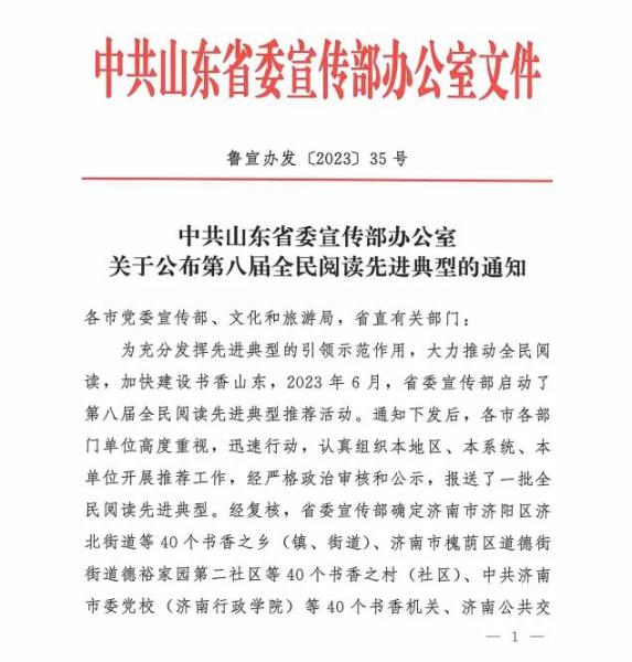 为充分发挥先进典型的引领示范作用,大力推动全民阅读,加快建设书香山东,2023年6月,省委宣传部启动了山东省第八届全民阅读先进典型推荐活动,邹平市图书馆荣获“全民阅读示范基地”称号。