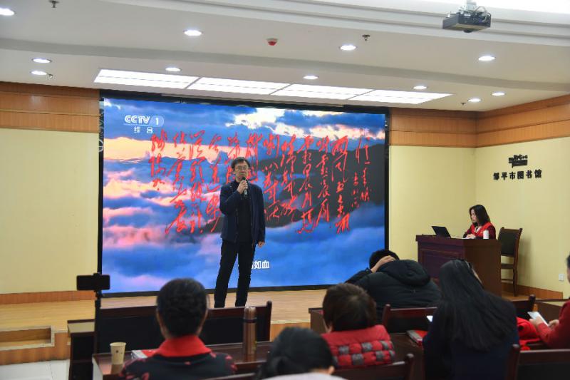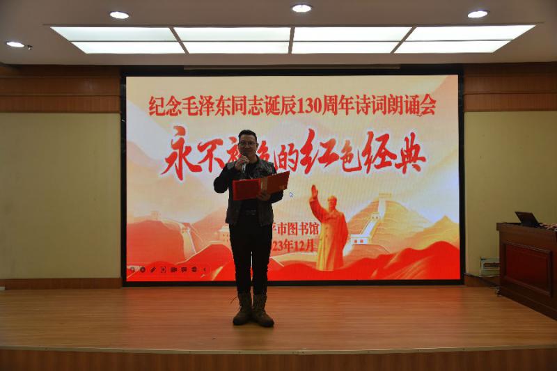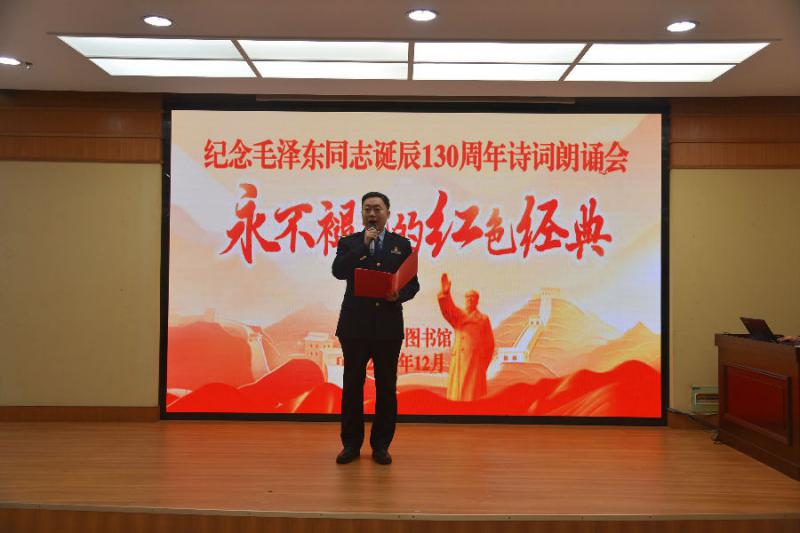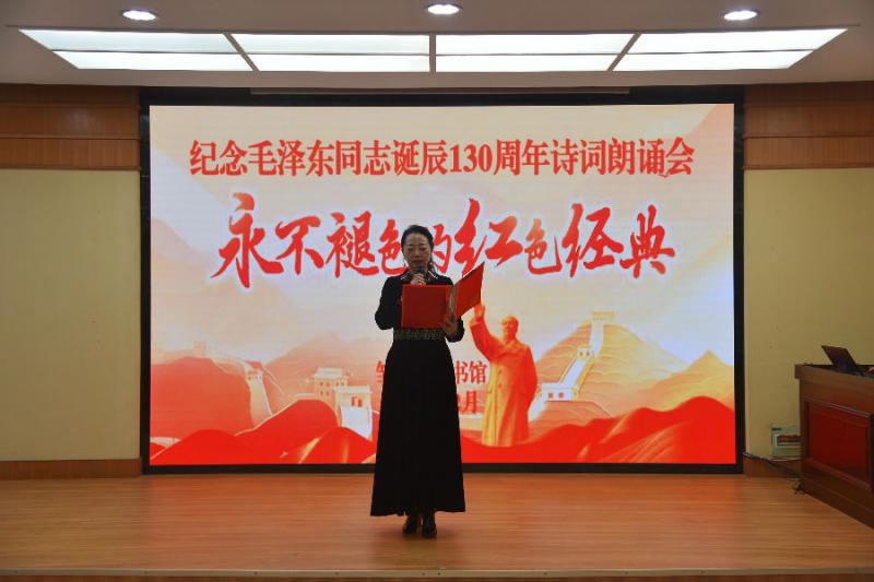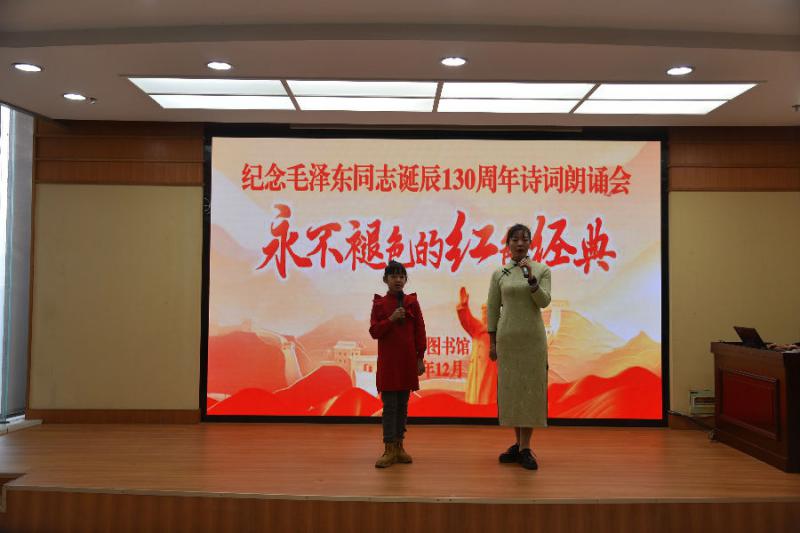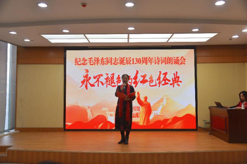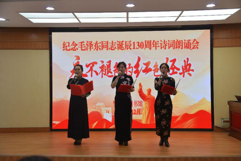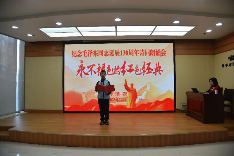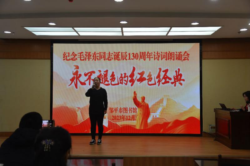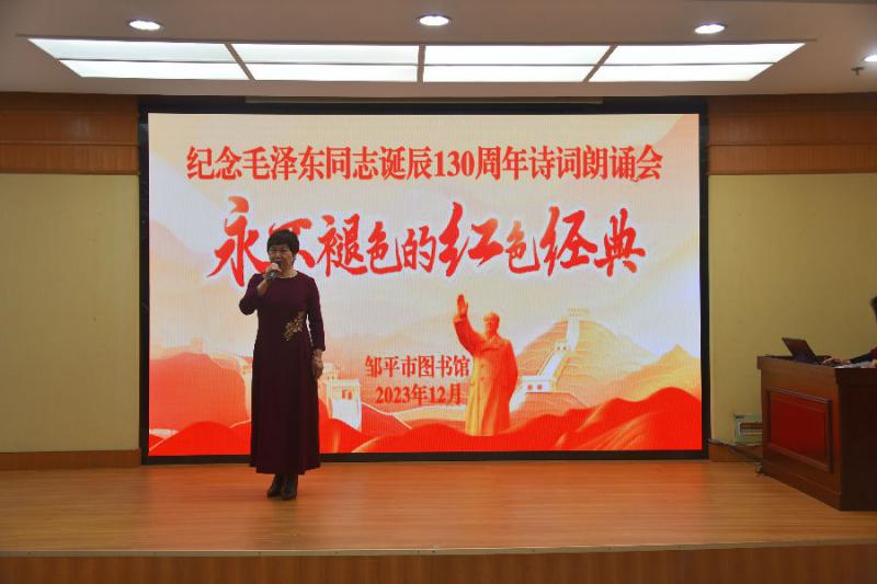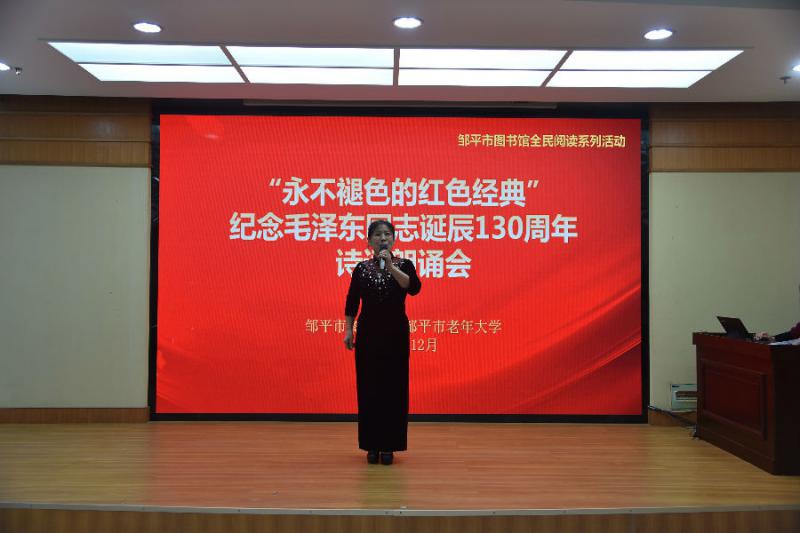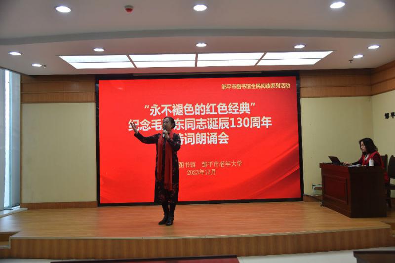 为纪念毛泽东同志诞辰130周年,12月23日,邹平市图书馆举办“永不褪色的红色经典”主题诗词朗诵会。市机关政务保障中心、青阳交管所、高新小学等“悦读驿站”的诗词爱好者、市老年大学学员及各位读者朋友共同漫步诗境,吟咏青春,点燃激情,感受红色经典,在笔墨书香中重温那段峥嵘岁月,感受毛泽东的壮志豪情,缅怀一代伟人!