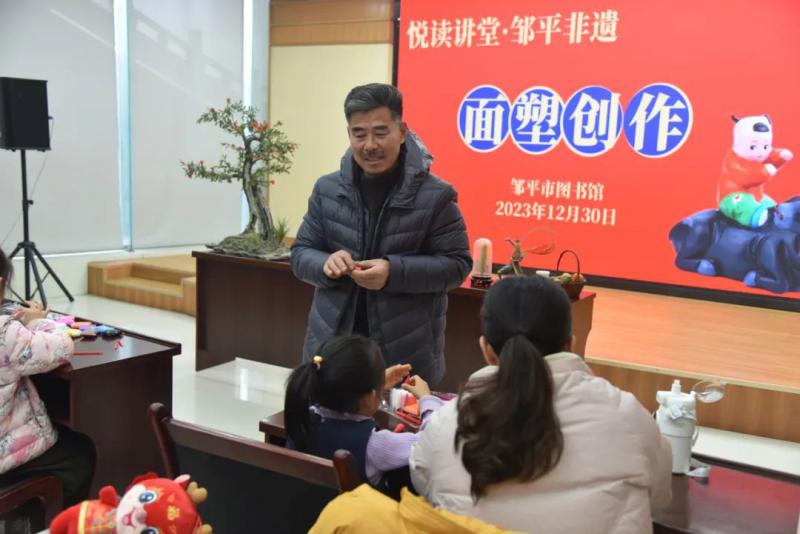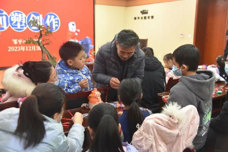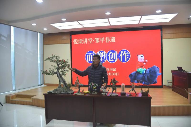 12月30日上午,图书馆开展邹平非遗系列活动第二期——面塑创作。邹平市非物质文化遗产面塑创作传承人王兴忠老师走进“悦读讲堂”,当孙悟空、关公、石榴树、水杏、大葱等一个个面塑作品摆上桌时,便引来了众多小朋友和家长的惊奇目光,连连称赞。