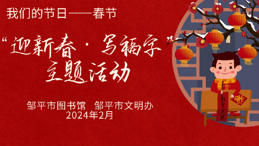 为进一步弘扬中华民族传统文化,营造喜庆祥和的文化氛围,邹平市图书馆“悦读讲堂”开展 “迎新春·写福字”活动。活动邀请邹平市文化和旅游局工会主席、书法家协会副秘书长周猛手把手教读者朋友们写福字,跟您一起感受浓浓年味。
