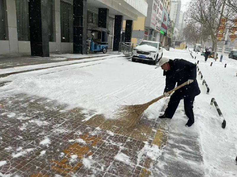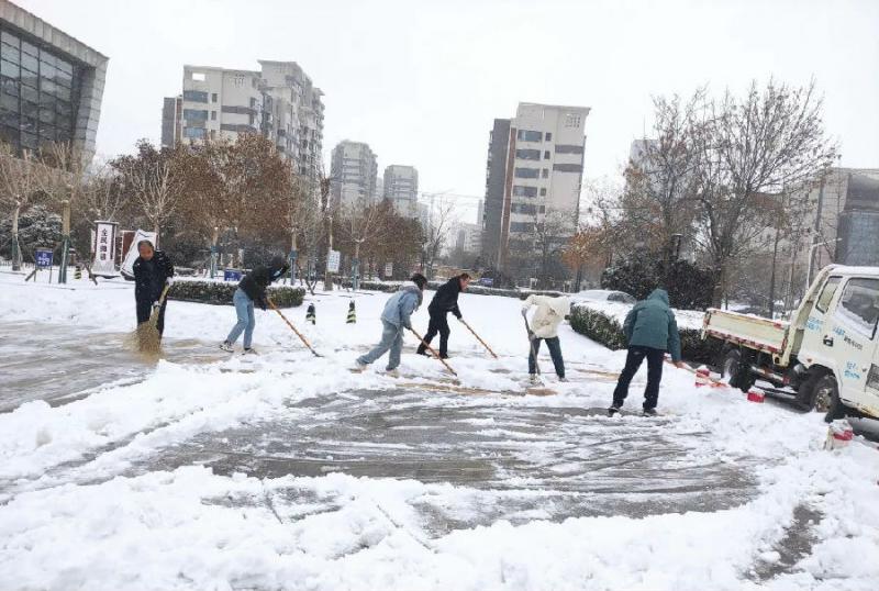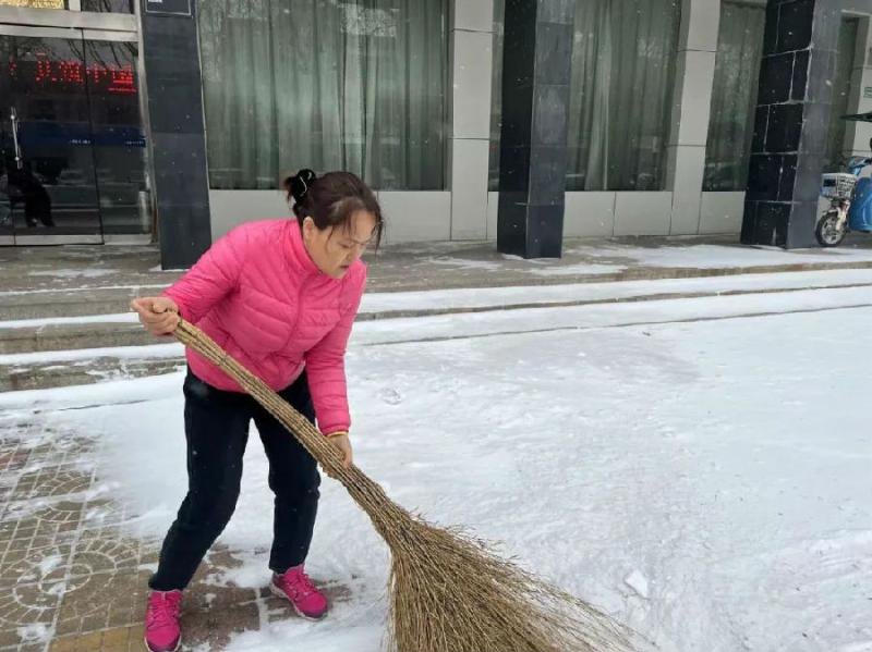 大家分工明确,拿起铁楸、扫帚等工具,一铲一扫相互配合,奋力清扫图书馆文化广场及进馆路段冰雪。