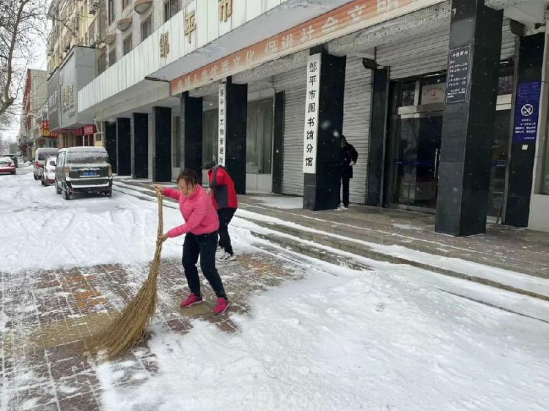 为保障读者进馆道路安全畅通,给读者提供安全、便捷、舒心的阅读环境,2月21日清早,邹平市图书馆工作人员联合物业管理员齐上阵,迎雪而上,即下即扫,扫雪除冰。