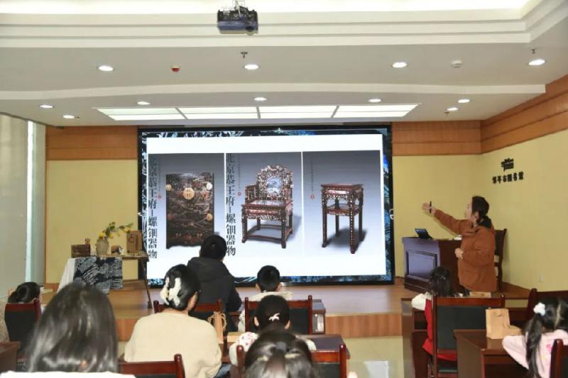 课程开始,一幅幅“重磅”组图展示,恭王府方角柜、扶手椅、茶几,金盘陀、大漆珠手串等将螺钿工艺制作的细节感、奢华感、匠心感瞬间拉满;随后主讲老师为大家讲解螺钿工艺起源、发展、主要材料、工艺特点等;重点将制作流程分步讲述,与大家一起融入自己的灵感与“匠心”,共同体验“穷极精巧”的螺钿魅力。