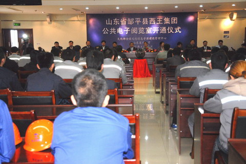 推动公共电子阅览室进入企业和工业园区,切实保障农民工文化权益,丰富农民工精神文化生活,是各级文化共享工程分支中心“十二五”时期的重要工作方向。在文化部全国文化信息资源建设管理中心和山东省文化厅共同努力下,山东省邹平县西王集团公共电子阅览室于4月12日正式开通。文化部全国文化信息资源建设管理中心主任张彦博出席开通仪式。山东文化厅副厅长李宗伟,文化部全国文化信息资源建设管理中心副主任刘惠平,西王集团总经理王栋,邹平县县委常委、副县长尹艳玲分别致辞。来自西王集团的近200名农民工参加了仪式。仪式由邹平文化局长杨延文主持。