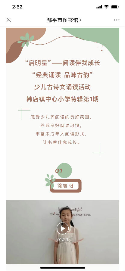 感受少儿齐阅读的良好氛围,养成良好阅读习惯,丰富未成年人阅读形式,让书香伴我成长。开展韩店镇中心小学特辑少儿古诗文诵读活动,每期展播6个诵读视频。