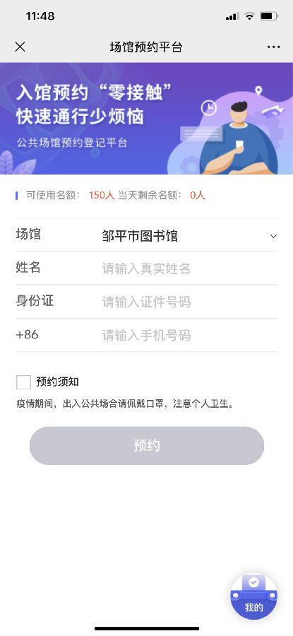 点击底部菜单栏“读者服务”→“预约进馆”进入预约平台