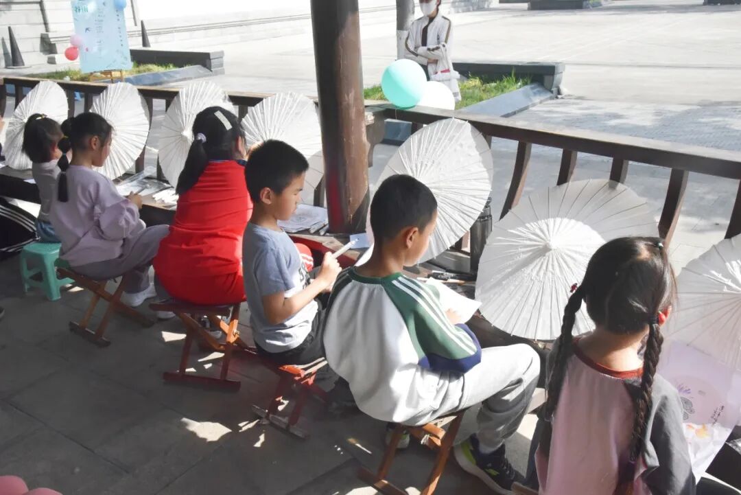 绘制过程中孩子们排排坐在长廊下,参照图片上的图案,再添加点自己的想象力,油纸伞上渐渐有了雏形。