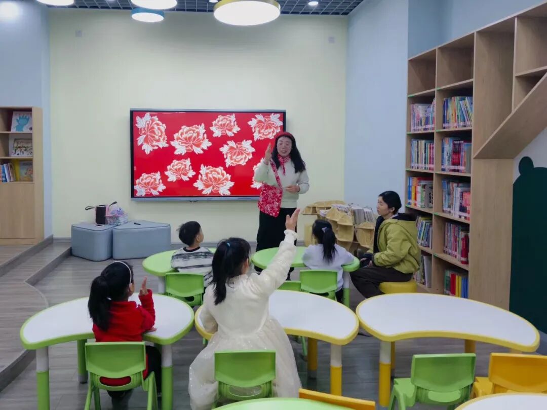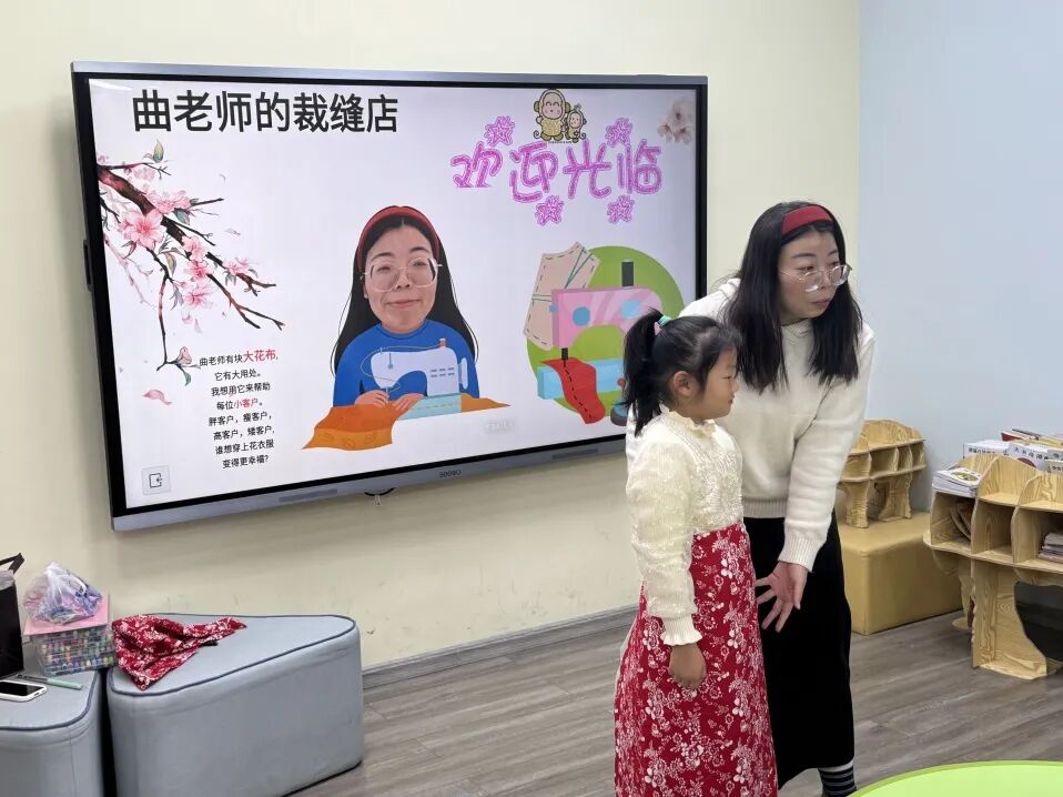 活动一开场,曲老师就变身“时尚达人”,红底白花的布艺领巾俏皮地系在颈间,同款花布做成的小帆布袋斜挎肩上,瞬间抓住了所有小眼睛!“这是谁做的呢?”曲老师神秘地眨眨眼。在一片好奇的童声中,绘本讲述开始了。